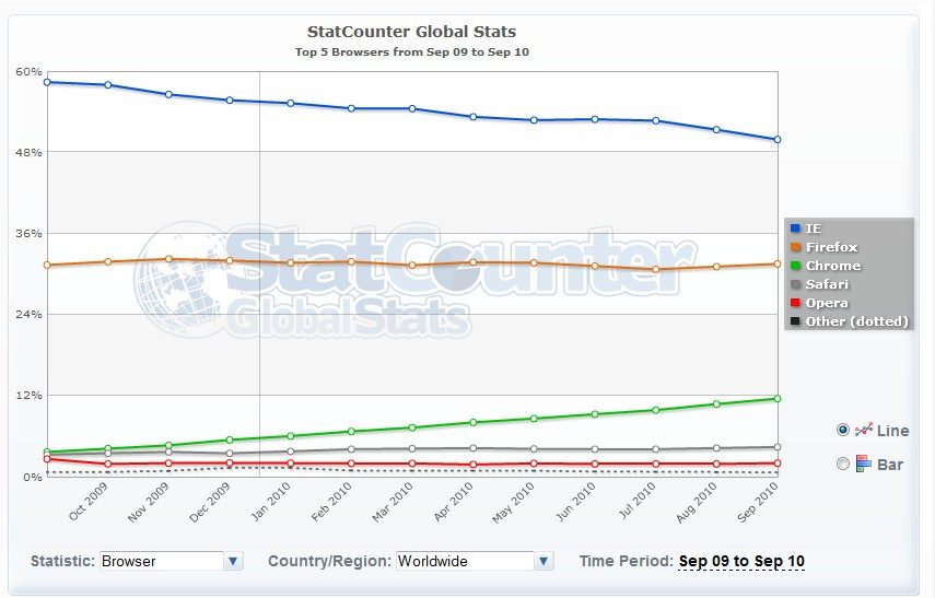 Elle a atteint précisément 49,8 % (contre 67 % il y a deux ans) devant Firefox et ses 31,5 %. Le Chrome de Google aurait incroyablement progressé entre septembre 2009 et 2010, passant de 3,69 % à 11,54 %.