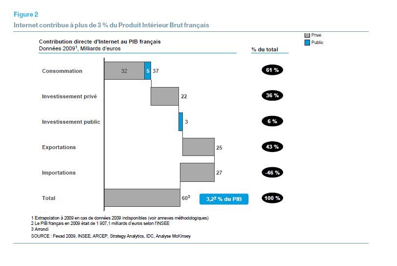 L’avenir économique de la France serait-il lié à Internet ? En tout cas, le poids du secteur ne cesse de croître. La contribution du réseau des réseaux à l’économie nationale est estimée par le cabinet d’études McKinsey à 60 milliards d’euros. Soit 3,2 % du PIB en 2009 – et, selon ses projections, 3,7 % en 2010 (72 milliard d’euros). C’est plus que « les transports, l’énergie, l’agriculture [pris séparément, NDLR] », note le rapport « Impact d’Internet sur l’économie française », qui vient d’être publié. « Les deux tiers de sa contribution sont dus à la consommation des biens et des services, le tiers restant provient d’investissements privés qui correspondent pour l’essentiel à des dépenses destinées à l’adaptation des entreprises aux technologies numériques. » D’ici à 2015, Internet devrait constituer 5,5 % du PIB, pour un total de 129 milliards d’euros, estime McKinsey. « La filière dépasserait ainsi par son poids dans le PIB le secteur de l’automobile. »