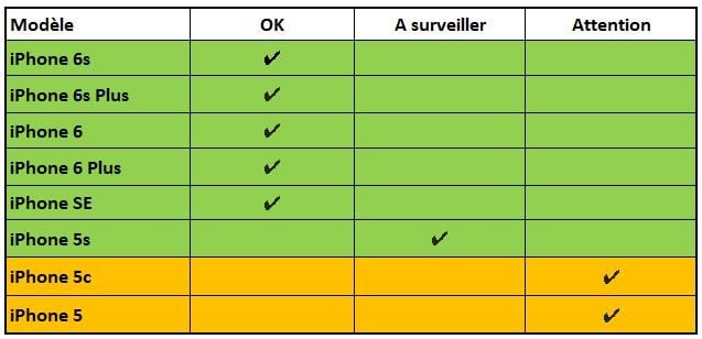 Pour les iPhone 5s, 5 et 5c, il faudra cependant voir avec le temps si la réactivité reste au rendez-vous. Par expérience, elle peut se dégrader après quelques semaines ou mois d’utilisation. C’est pourquoi nous avons préféré les classer dans les cases « A surveiller » et « Attention ». Les plus prudents attendront donc les retours des autres utilisateurs avant de craquer pour la mise à jour.