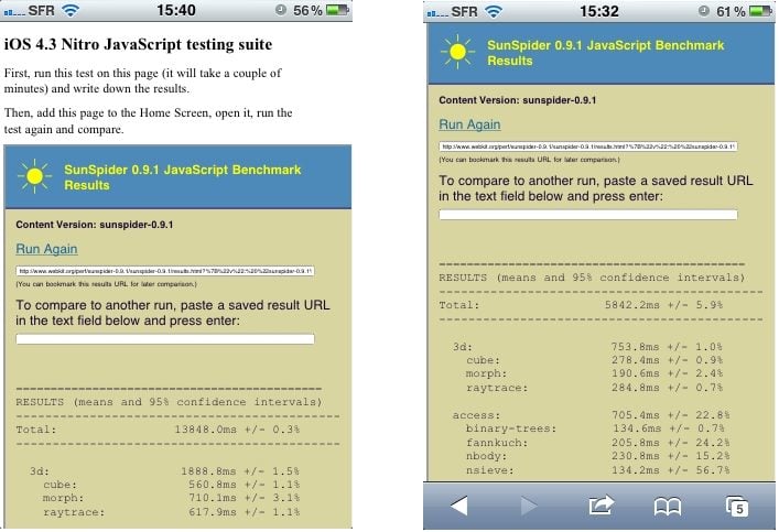 Pour M. Firtman, l’explication de cette énorme différence est toute trouvée : le nouveau moteur Javascript de Safari, Nitro, inauguré avec iOS 4.3, n’est pas utilisé dans le second cas de figure, alors qu’il fonctionne dans Safari. Par ailleurs, M. Firtman précise sur son blog qu’il y a en réalité une grosse différence entre Safari et la fonction UIWebView d’iOS, qui est utilisée lorsqu’on lance une application Web à partir de l’écran d’accueil… UIWebView permet aussi aux développeurs d’applications natives d’appeler un navigateur dans leurs programmes.