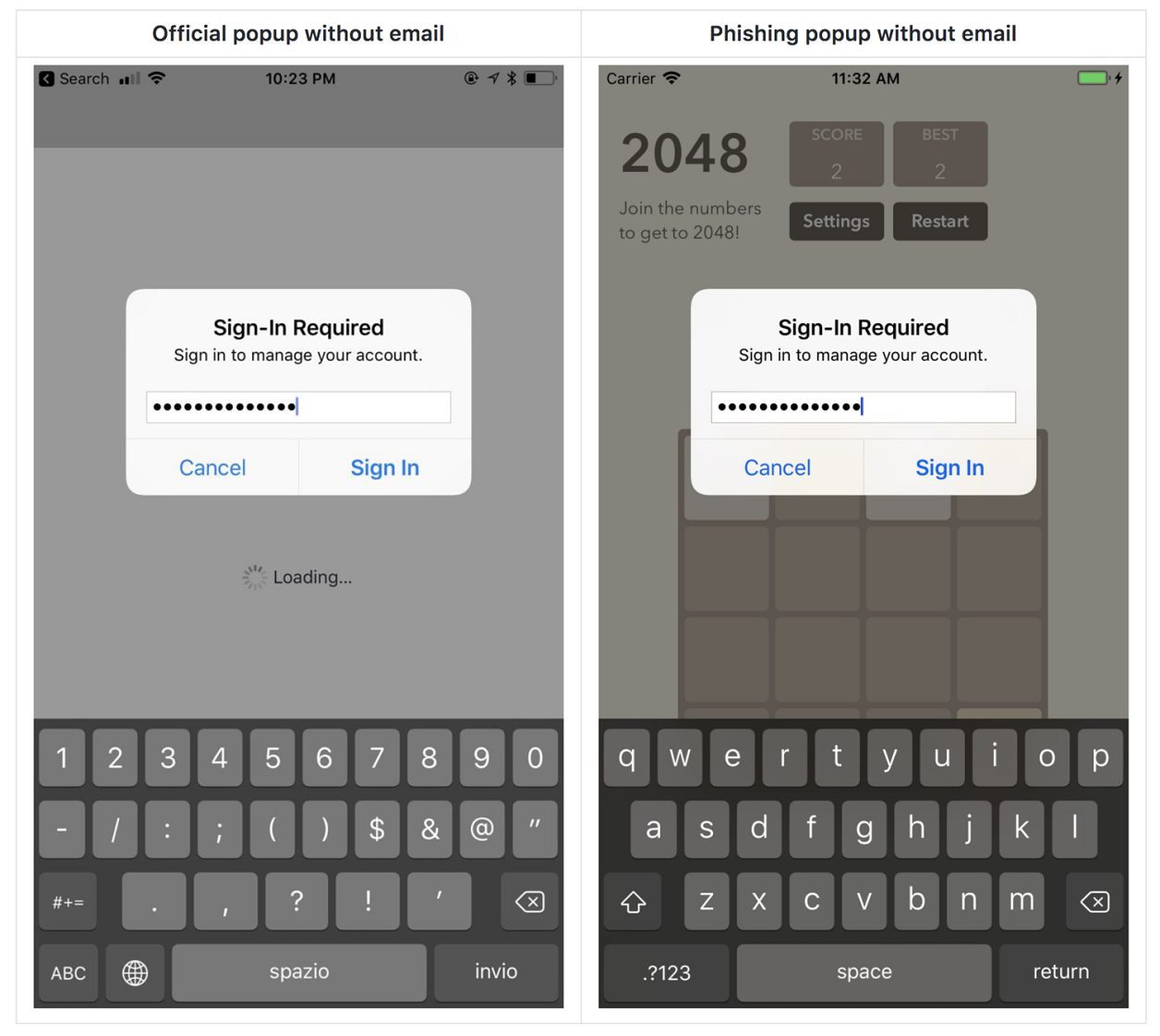 Les utilisateurs peuvent facilement tomber dans le piège, tant ce pop-up est courant. On le remplit souvent machinalement, sans jamais se douter d’un phishing est possible. Les applications peuvent demander ce mot de passe pour, par exemple, accéder à iCloud, au Game Center ou confirmer un achat intégré.