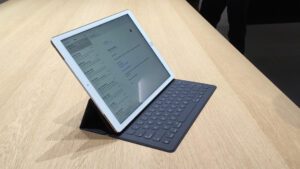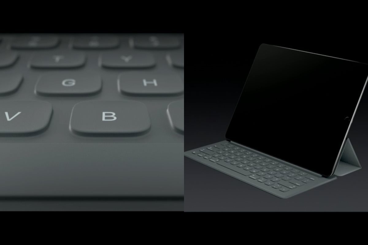 Le Smart Keyboard permet de poser l’iPad Pro sur un socle connecté via une nouvelle interface magnétique à trois points, sans connexion Bluetooth. Ce clavier reprend le système de touches exclusif qu’Apple a mis en place sur son dernier Macbook.