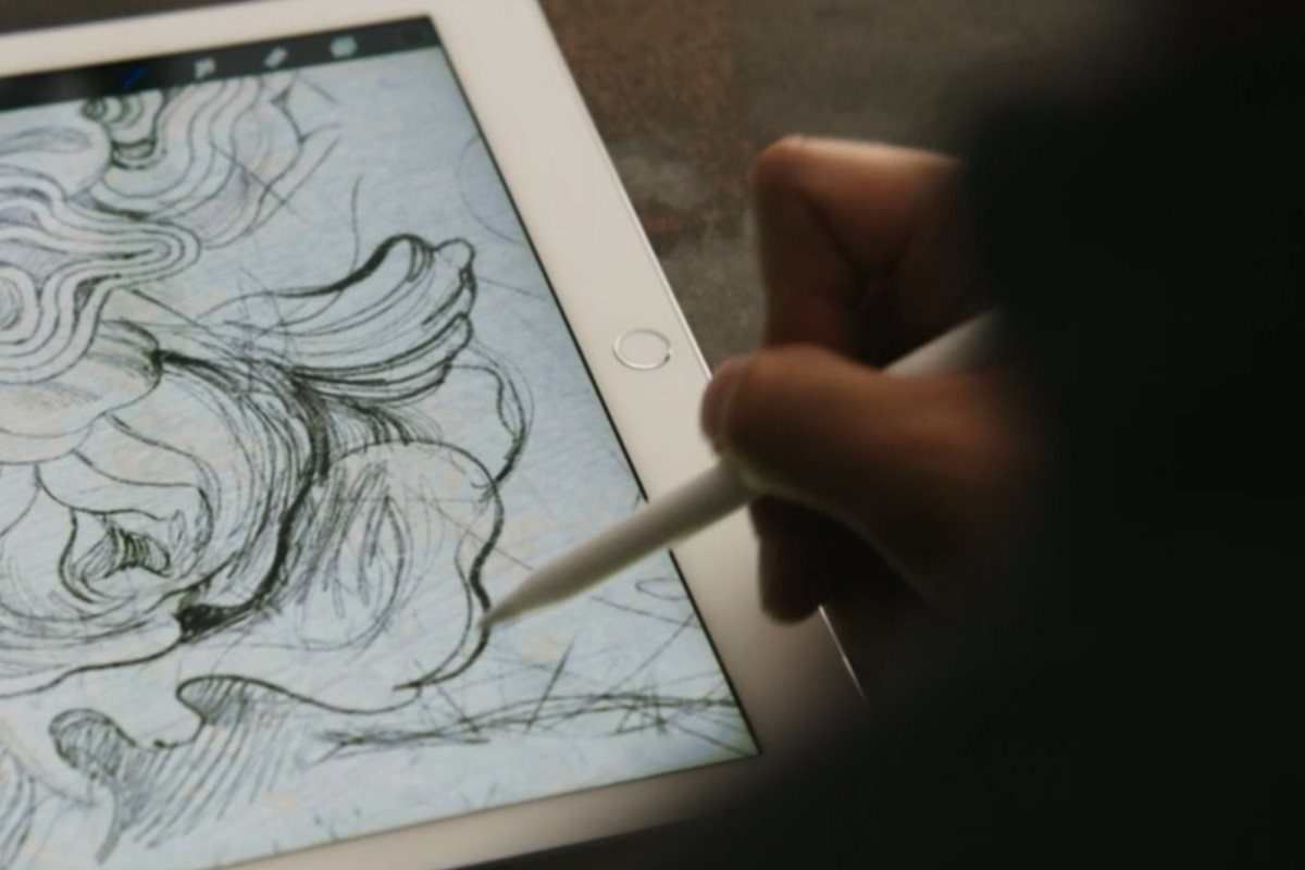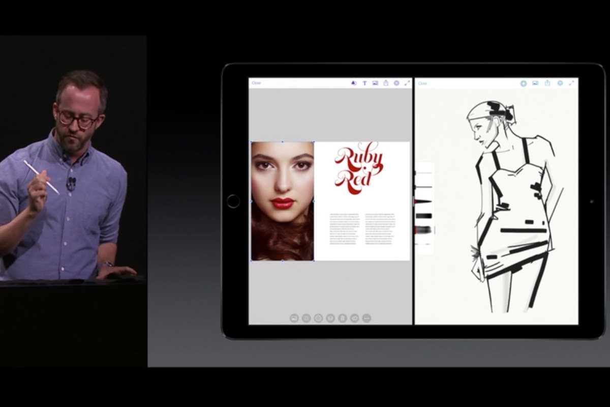 C’est la première fois qu’Apple lance un stylet pour ses tablettes. C’est l’Apple Pencil, qui permet de dessiner, avec des capteurs de pression pour épaissir le trait… Mais aussi deux autres capteurs de position et d’angle d’attaque sur la dalle pour encore plus de précision dans le dessin. Ce stylet est destiné à la productivité : Microsoft (oui !) et Adobe en ont profité pour montrer quelques possibilités très encourageantes. On pense surtout au multitâche, avec le transfert d’un contenu fraichement produit d’une application vers une autre. Il est possible de recharger le stylet en le branchant directement sur le port Lightning de la tablette.