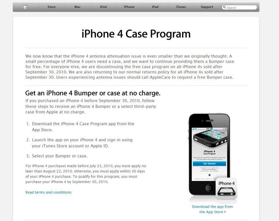 Mais tout en mettant fin à son programme, Apple reconnaît à demi-mot des problèmes de réception. Il prend soin d’expliquer qu’« un petit pourcentage d’iPhone 4 a besoin d’un étui, et nous voulons continuer à fournir gratuitement un Bumper [une coque made by Apple, NDRL] à leurs utilisateurs. Ceux qui expérimentent des problèmes d’antenne devront contacter l’AppleCare pour demander un étui gratuit. »