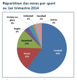 Le niveau des mises des paris sportifs (254 millions d’euros) a augmenté de 25 % par rapport au premier trimestre 2013. Les mises de football (60 % des paris sportifs) continuent « d’alimenter considérablement » l’activité globale de paris, analyse l’Arjel qui constate que les grands événements du calendrier réunissent de plus en plus de joueurs sur les sites des opérateurs français agréés. Un phénomène qui devrait être accentué avec le début de la Coupe du monde au Brésil à la mi-juin. Au 1er trimestre, 45 millions de paris sportifs ont été enregistrés, contre 36 millions durant la même période de 2013.