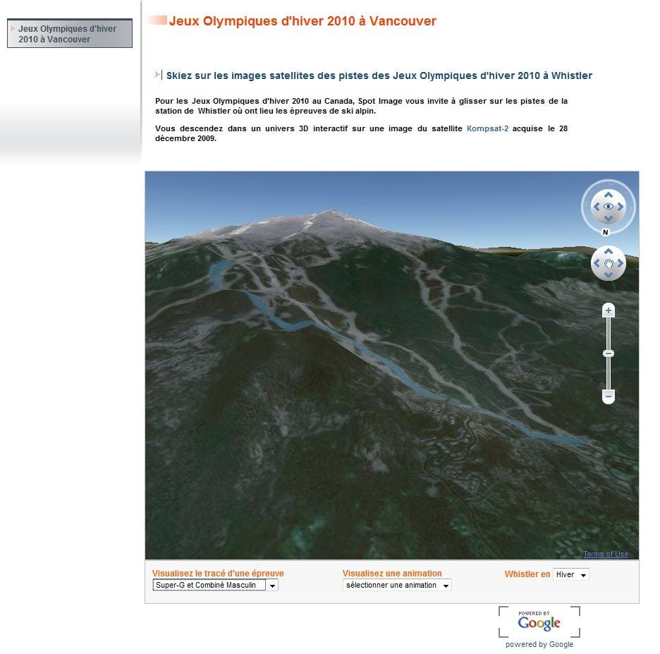 Il propose sur son site www.spotimage.fr une descente fictive des pistes du site olympique canadien sur la base de données d’imagerie satellitaires en 3D habituellement réservées à Google Earth et à d’autres clients civils, ou militaires, dans le monde (1).