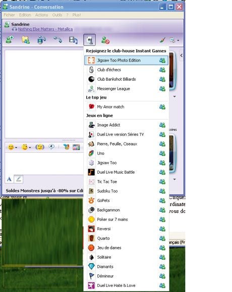Sur WLM, vous avez tout un tas de jeux à votre disposition, quiz musicaux, solitaire, morpion. Pour inviter un ami à jouer avec vous, cliquez sur l’icône Voir la liste des jeux.Et choisissez un jeu. Attendez que votre adversaire ait accepté l’invitation. Vous pouvez alors vous lancer dans une partie effrénée déchecs, de pierre-feuille-ciseaux, de backgammon, de poker ou de uno.