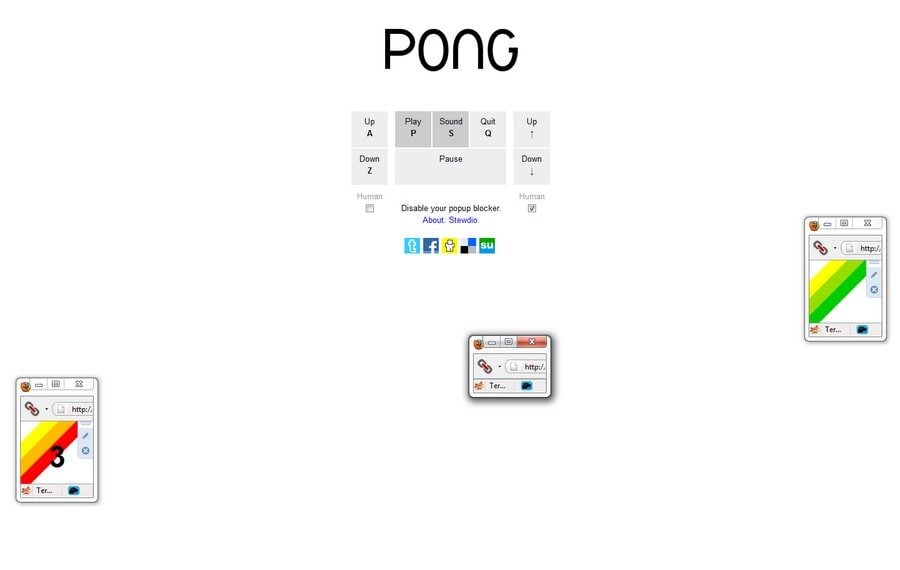 Pong, c’est l’un des tout premiers jeux vidéo au monde. Cette « simulation » de tennis de table, aux graphismes élémentaires, et qui faisait fumer les bornes d’arcades en 1972, prend place aujourd’hui dans les navigateurs Web. En guise de balle et de raquettes, le développeur a utilisé des fenêtres pop-ups.