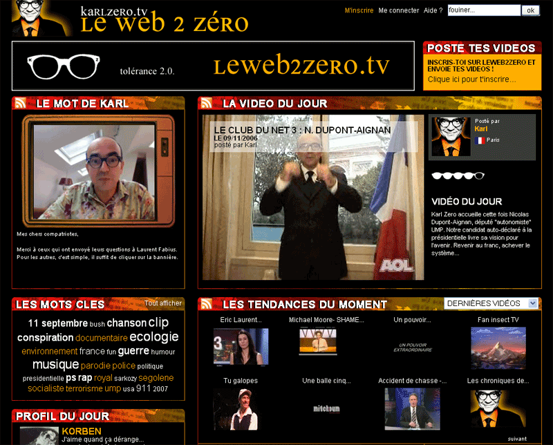 Rien à voir avec le Web 2.0, il s’agit ici du site de Karl Zéro. L’ex-présentateur du Vrai Journal sur Canal+ crée son antenne en ligne, une télé collaborative. Comme sur YouTube, les internautes peuvent charger