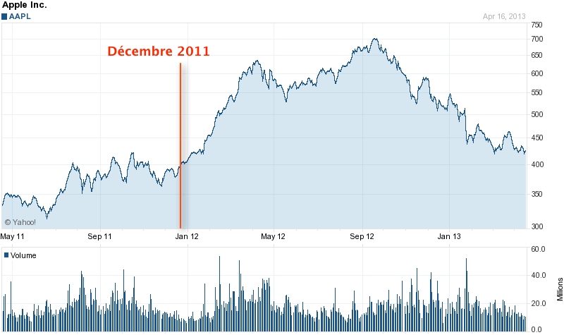 398,11 dollars… C’est la valeur plancher qu’a atteint hier l’action d’Apple. Il faut remonter à décembre 2011 et avant la croissance soutenue de son cours pour retrouver une telle valorisation. En septembre dernier, Apple voyait son action passer la barre des 700 dollars, certains analystes financiers lui promettaient même un avenir glorieux à plus de 1 000 dollars en 2014.
