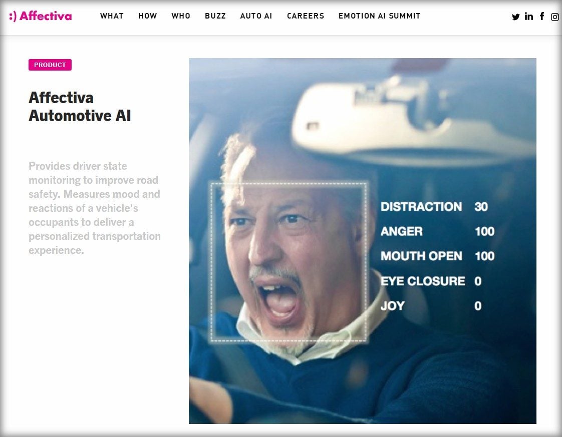 Certaines entreprises ont également décidé de se spécialiser sur le créneau de la détection émotionnelle. C’est par exemple le cas d’Affectiva, qui analyse le son de la voix et les expressions du visage. Elle propose sa technologie aux constructeurs automobiles, afin d’analyser l’état émotionnel du conducteur, mais aussi aux publicitaires, pour connaître les réactions des consommateurs face aux publicités. Dans ce dernier cas, toutefois, seules les expressions du visage sont prises en compte. Pour l’instant.