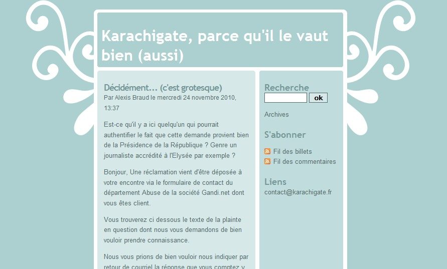 « Nous avons constaté que le site karachigate.fr renvoie automatiquement et sans aucune forme de précaution sur le site officiel de la présidence de la République… Ce renvoi est abusif et nous condamnons cette pratique, indique le courriel rapporté par le blogueur. Et de poursuivre, Je vous prie de faire le nécessaire pour mettre un terme dans les meilleurs délais à cette redirection abusive… Dans tous les cas la présidence de la République se réserve le droit de donner toutes les suites requises à cet abus dans le cadre du respect de ses droits ».
