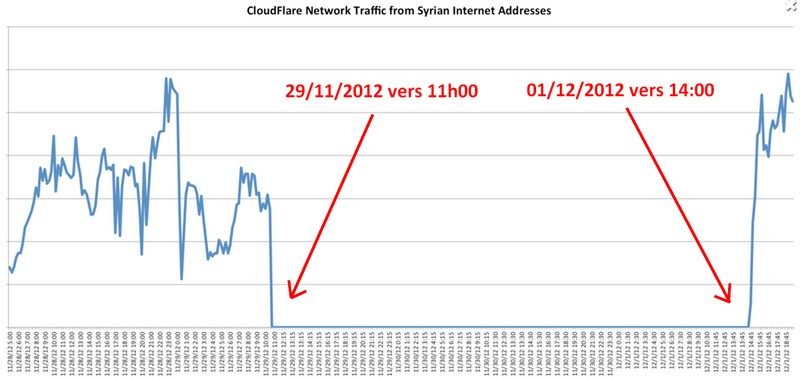 Après une coupure totale survenue jeudi 29 novembre, l’Internet syrien a été rétabli samedi dernier, 1er décembre. Vers la fin de la journée, presque l’ensemble du réseau avait repris du service. Le prestataire réseau Cloudfare a suivi la réactivation des liens minute par minute et en a fait une petite vidéo.