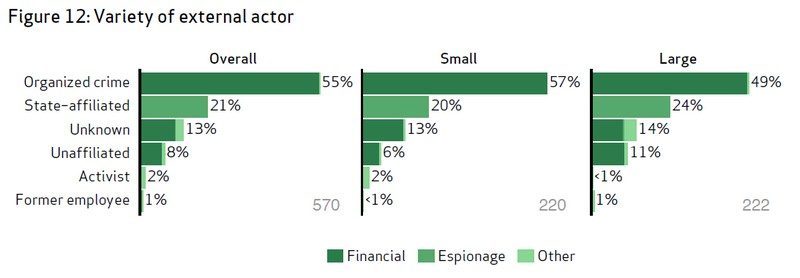 Après l’émergence éphémère des hacktivistes, les « suspects usuels » reprennent donc leurs places dans le classement par type de cybercriminel. Le crime organisé arrive en tête, avec 55 % des attaques externes, suivis par des organisations financées ou pilotées par des gouvernements étrangers (21 %). A commencer par la Chine, bien évidemment.