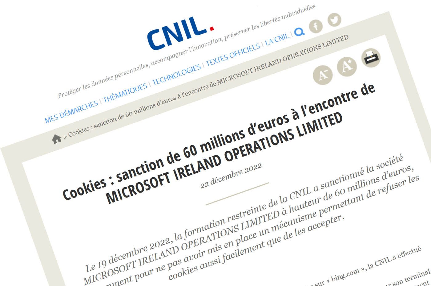 Le verdict de la CNIL vient de tomber : la Commission Nationale Informatique & des Libertés, qui protège les droits numériques des citoyens français, a infligé de 22 décembre une jolie amende contre Microsoft. Ou plus précisément à Microsoft Irlande qui gère le service réellement condamné, à savoir le moteur de recherche Bing. Le délit ? Un dépôt de cookies chez les utilisateurs impossible à refuser.