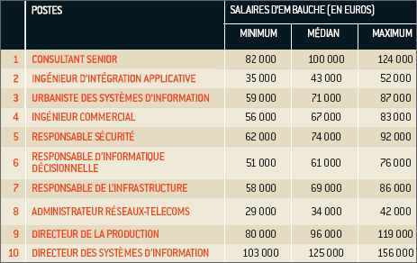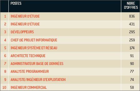 le marché de l’emploi. Ce classement, établi sur 75 postes informatiques, met en relief les dix profils où la tension est la plus forte actuellement, faute d’une bonne adéquation entre les exigences des entreprises et la