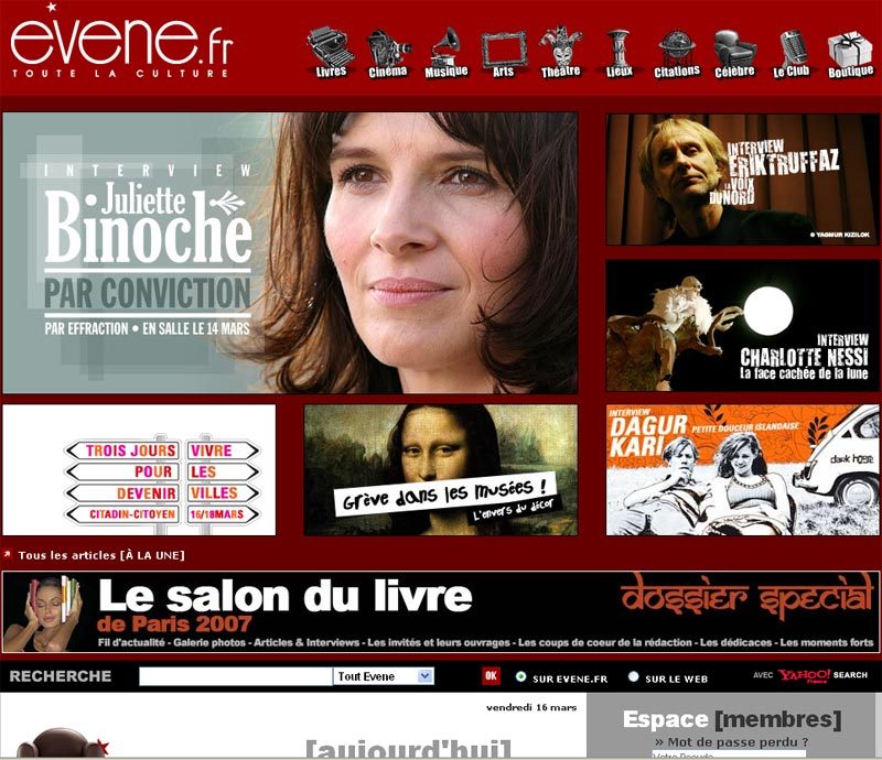 cinéma, lieux, musique, théâtres, citations, célèbres, le club et boutique. On peut ainsi découvrir l’interview du dernier auteur en vogue, le festival de BD d’Angoulême, des lieux culturels de France, lire la critique du film polémique du moment,