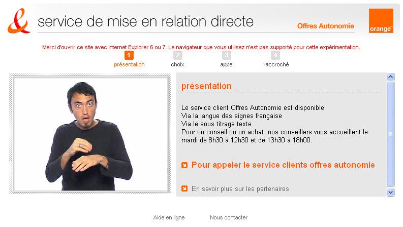 opérateur sont généralement limitées à l’écrit.Pour aller au-delà des échanges par e-mail ou par télécopie avec cette clientèle, Orange teste un nouveau canal de communication : la visioconférence en langue des signes. Pour le moment, l’expérience est menée sur un service
