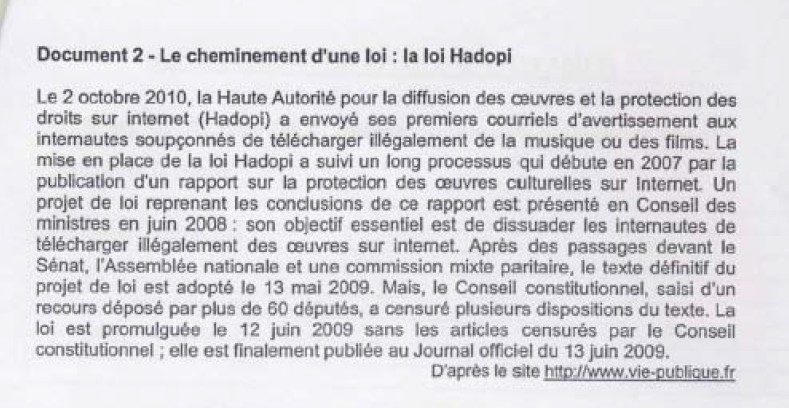 Ce texte, un extrait remanié d’un article du site Vie-publique.fr, retrace le cheminement de la loi, en démarrant par l’envoi des premiers courriels d’avertissement fin 2010. Il évoque ensuite le point de départ de la loi, à savoir la mission confiée à Denis Olivennes, à la rentrée 2007, mais dans l’extrait du brevet, l’ex-patron de la Fnac n’est plus évoqué. Idem pour l’accord de l’Elysée de novembre 2007, entre représentants de l’industrie culturelle et les FAI.
