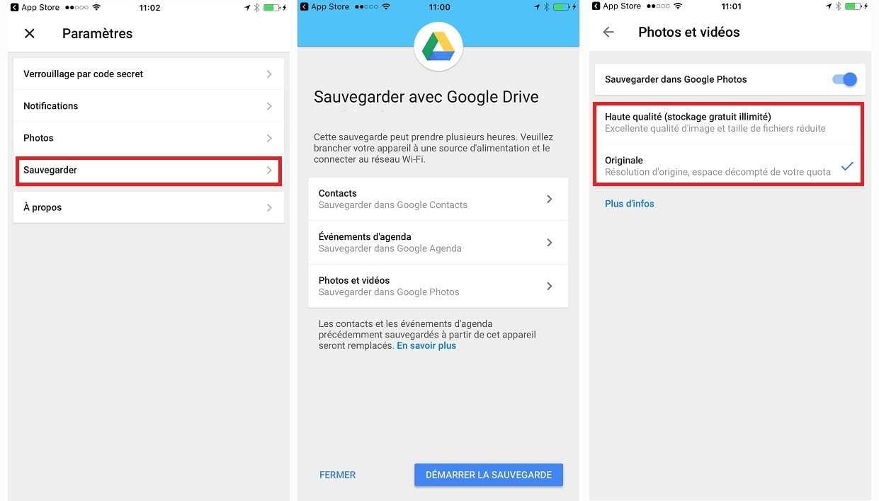 Pour cela, il faut se rendre dans les paramètres de l’application puis dans la rubrique « Sauvegarder ». Une attention toute particulière est requise pour les photos et vidéos. Par défaut, l’application sauvegarde en effet ces contenus en résolution d’origine, cet espace sera donc décompté de votre quota Google Drive (15 Go gratuits par défaut). Il est possible alors de réduire leur qualité pour bénéficier d’un stockage gratuit et illimité.