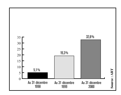 La part de marché des nouveaux entrants en France en volume de communications longues distances (interurbaines et internationales)