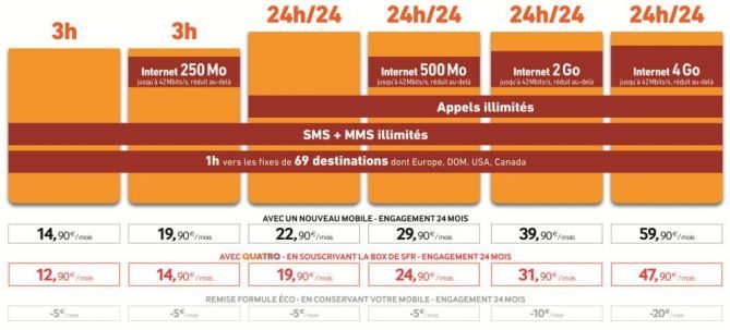 Son offre Quatro propose à ses clients mobiles une remise mensuelle pouvant aller jusqu’à – 12€ sur leur forfaits. A titre d’exemple, le tarif de l’offre 24h/24 avec 2Go/mois sera ramené à 31,90€/mois (sur 24 mois d’engagement) pour un client souscrivant aussi à la box de SFR, soit 10€/mois d’économies. Le tarif de l’offre 3h+ 250Mo passe à 14,90€/mois (sur 24 mois d’engagement) pour un client souscrivant à la box de SFR, soit une réduction de 5€/mois.