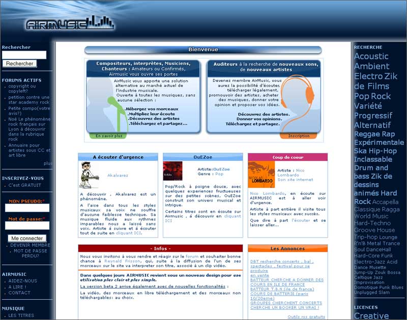 Airmusic est un nouveau site destiné à promouvoir, gratuitement, des musiciens et des chanteurs. Le site vous propose, après inscription, d’héberger vos morceaux de musique, mais aussi des images, et de les soumettre aux internautes.