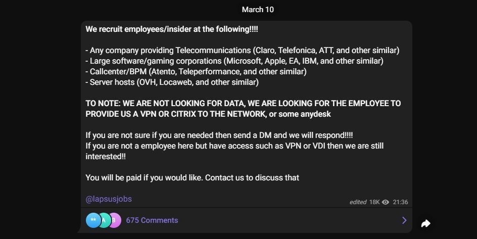 Aux dernières nouvelles, Lapsus$ cherche à recruter des taupes dans une série d’entreprises issues des télécoms, de l’édition de logiciels, des call centers ou de l’hébergement. Désormais, ils voient les choses en grand.