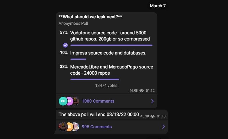 MercadoLibre a d’ores et déjà confirmé le piratage. Des codes sources et les données de 300 000 utilisateurs seraient bien dans la nature. Du côté de Vodafone, les investigations sont encore en cours. Lapsus$ menace de publier environ 200 Go de données compressées relatives à des codes sources de l’opérateur. D’après le sondage en cours, il y aura peu de surprise : c’est bien Vodafone qui sera le prochain sur la liste.