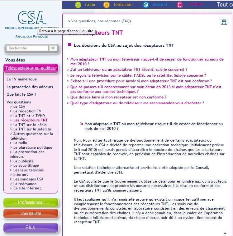 Le Conseil supérieur de l’audiovisuel a contourné le problème, en repoussant de 2010 à 2013 la mise en place des paramètres de transmission qui posaient souci. Maintenant, il tente de rassurer les consommateurs. L’organisme vient de publier une série de questions-réponses, qui s’adresse à ceux qui sont déjà équipés pour la réception en numérique comme à ceux qui souhaitent sauter le pas. Seulement sept sujets sont traités, mais ils répondent aux préoccupations essentielles.
