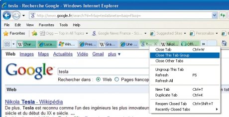 Internet Explorer 8 n’est pas en reste : s’il est impossible de glisser un onglet hors de la fenêtre, le navigateur introduit la notion de groupes d’onglets. Si vous ouvrez un nouvel onglet à partir d’un lien sur une