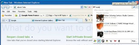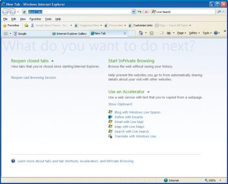 Les deux navigateurs proposent de nouvelles fonctions lors de l’ouverture d’un nouvel onglet vide. En lieu et place d’une page vide, du contenu est déjà proposé par défaut. Avec IE8, toute une série de nouvelles actions