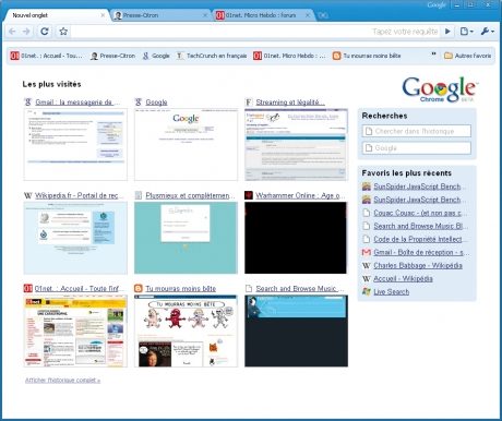 Chrome va un peu plus loin : il se charge d’afficher, sur le nouvel onglet, des miniatures des sites les plus visités, des formulaires de saisie pour lancer des recherches sur différents moteurs, ainsi que les favoris les
