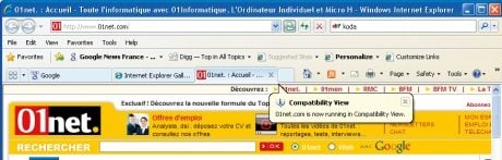 technologies Web de demain, plus que pour celles d’aujourd’hui.Reste que, pour certains sites qui s’étaient adaptés à IE7, IE8 affichera un rendu un peu étrange. Microsoft a donc introduit un mode de compatibilité : il suffit de cliquer sur l’icône en forme de feuille déchirée, juste à