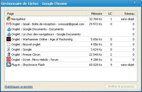 logiciel en ligne comme Google Docs, etc.) n’est absolument pas affecté, ni même ralenti.Chrome permet même de vérifier, avec un Gestionnaire des tâches intégré, que l’on peut invoquer en tapant simultanément sur les touches Maj + Echap, l’utilisation mémoire de chacun des onglets et des extensions. Facile