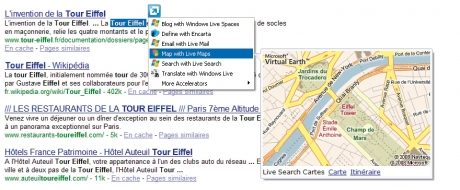 Elles ont changé de nom entre la bêta 1 et la bêta 2, mais les Activités sont toujours présentes, désormais appelées Accelerators. Il s’agit de menus contextuels, qui permettent d’accéder à de nombreux services Web