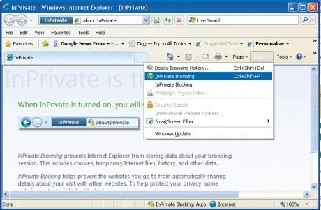 Avec IE8, ces options sont beaucoup plus complètes : il s’agit des modes InPrivate. Ceux-ci permettent de naviguer sans laisser de traces, mais également de visualiser la liste de tous les sites qui cherchent à récupérer