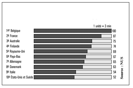 Le classement décroissant des pays selon le prix en centimes de lunité pour un appel local en février 2001