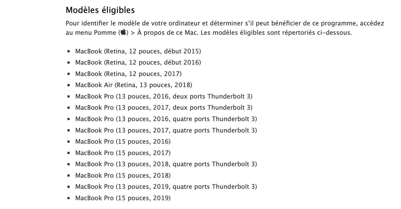 Dorénavant, il sera possible de faire réparer gratuitement son clavier dans les quatre ans suivant l’achat de son ordinateur. Tous les MacBook avec clavier papillon sont concernés, du MacBook de 2015 au MacBook Pro annoncé hier.