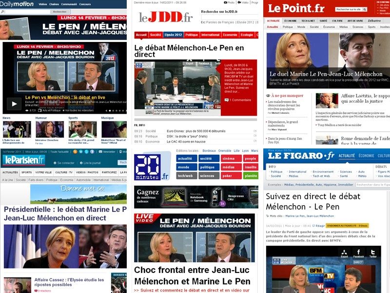 Ce 14 février 2011, BFM TV organisait entre 8 h 30 et 9 h 30 un débat entre Jean-Luc Mélenchon, président du Parti de gauche, et Marine Le Pen, nouvelle présidente du Front national. Présenté par la chaîne comme le « premier débat de l’élection présidentielle 2012 », l’échange était diffusé en direct sur les sites de BFM TV, de RMC (1) et de leur partenaire Dailymotion, mais aussi sur ceux de nombreux titres de la presse, en vertu d’accords noués pour l’occasion. « C’est la première fois que cela a lieu » précise Geoffrey La Rocca, responsable des activités numériques de RMC.