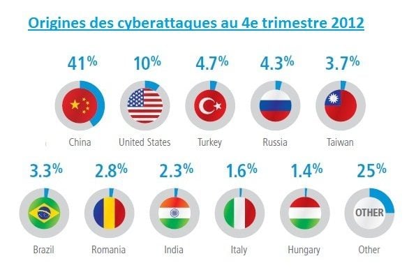 L’entreprise s’est également penchée sur les questions de cybersécurité. Selon les données qu’elle a recueillies, 25 % des attaques de trafic au cours du quatrième trimestre 2012 ont visé l’Europe. On trouve en tête des pays « agresseurs » la Chine (41 % des attaques), suivie par les Etats-Unis (10 %) et la Turquie (4,7 %). Des chiffres qui confirment un précédent rapport de la société Verizon qui désignait la Chine comme plus grand cyberespion de la planète.