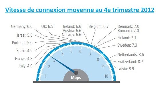 Si l’Hexagone se maintient au 36e rang mondial en matière de vitesse de connexion moyenne à Internet, avec un score de 4,8 Mbit/s (+18 % en un an), il demeure à la traîne au niveau européen. La France est en effet largement devancée par la Lettonie (8,9 Mbit/s), la Suisse (8,7 Mbit/s), les Pays-Bas (8,6 Mbit/s) ou encore la Suède (7,3 Mbit/s). Seule l’Italie fait moins bien avec une connexion moyenne de 4 Mbit/s.