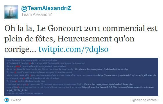 Oh la la, Le Goncourt 2011 commercial est plein de fôtes. Heureusement qu’on corrige ! » Le message ironique a été posté ce lundi 14 novembre* sur Twitter par la team Alexandriz. Ce collectif d’internautes férus de lecture met en ligne des ouvrages présents dans le commerce, parfois après les avoir scannés, décoquillés, mis en forme… au prix d’un travail fastidieux et méticuleux.