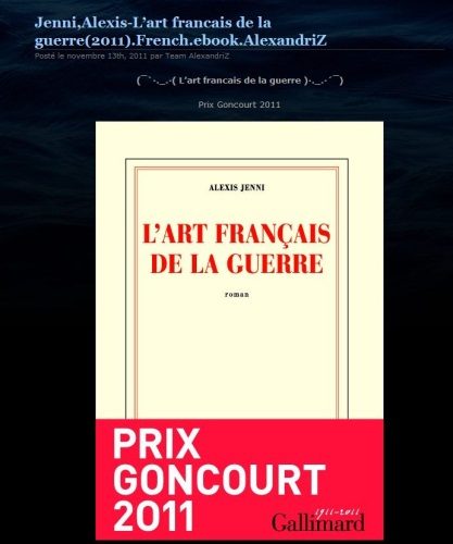 Evidemment, la team n’est pas très pointilleuse avec le respect des droits d’auteur, mais l’initiative a le mérite de redonner une seconde vie, numérique, à des œuvres condamnées à disparaître. Elle s’est ainsi attaquée au Goncourt 2011, L’Art français de la guerre, rapporte le site ebouquin.fr.
