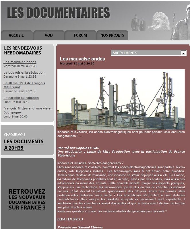 France 3 diffuse ce soir 18 mai, à 20 h 35, un documentaire de 80 minutes de Sophie Le Gall, intitulé Mauvaises ondes, consacré aux ondes électromagnétiques qui sont partout dans notre vie quotidienne aujourd’hui : micro-ondes, Wi-Fi, téléphonie cellulaire. « 64 millions de téléphones portables sont en activité, utilisés par des adultes, mais aussi des adolescents ou même des enfants », indique le texte de présentation sur le site de la chaîne.
