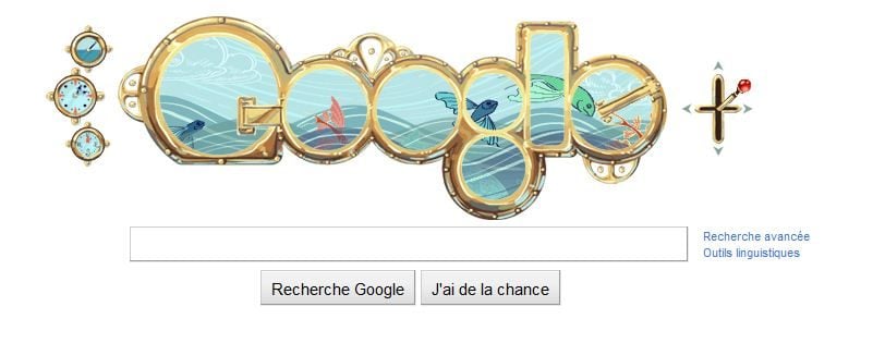 Google rend hommage à Jules Verne. Le moteur de recherche célèbre l’écrivain en habillant sa page d’accueil avec un logo spécial. Exit les lettres aux cinq couleurs. Le Doodle du jour se transforme en hublots au travers desquels les internautes peuvent admirer les fonds marins.