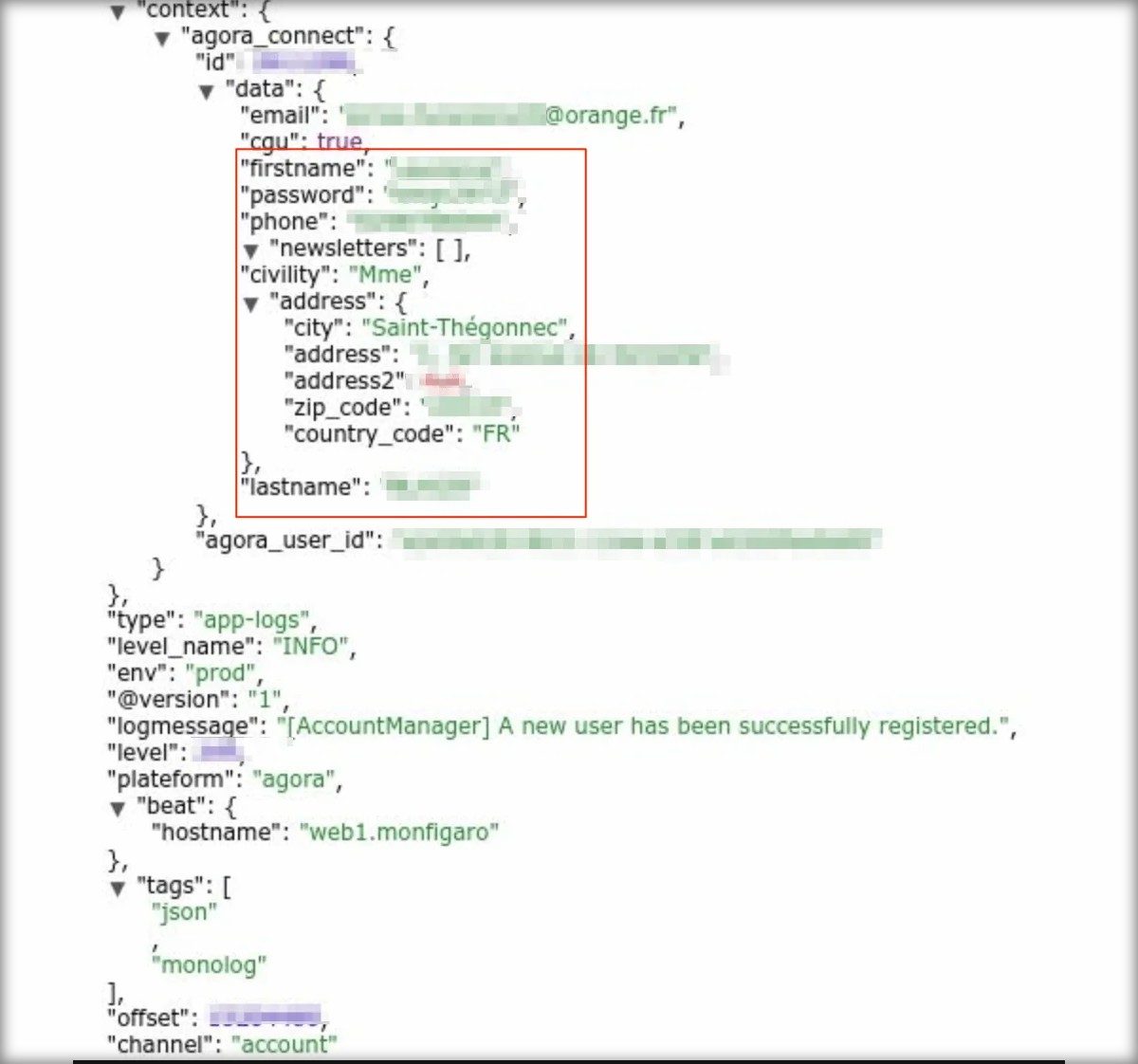 Ces 8 To de données contenaient des logs pour les sites du Figaro sur les trois derniers mois. Les chercheurs ayant accédé à cette base vers fin avril, les données qu’ils pouvaient examiner remontaient donc à début février. Le principal problème, c’est qu’elles exposaient les données personnelles des abonnés qui se sont connectés sur le site du Figaro durant cette période : noms complets, adresses électroniques, adresses postales, pays de résidence, adresses IP… Dans le cas d’une nouvelle inscription, le mot de passe figurait en clair dans les logs. Dans le cas d’une connexion d’un abonné existant, on voyait passer l’empreinte MD5 de son mot de passe, ce qui n’est pas beaucoup mieux. En effet, l’algorithme de hachage MD5 est désuet et peut facilement être cassé.