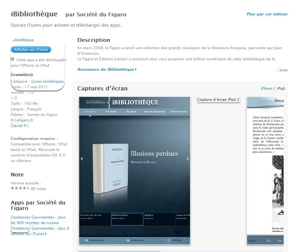 Cette sélection est aujourd’hui déclinée en version numérique avec iBibliothèque, disponible sur iTunes. Gratuite, l’application est compatible avec les iPhone, iPad, et iPod touch disposant au moins de la version 4.03 d’iOS. Pour sa réalisation, Le Figaro s’est associé avec les éditions Garnier.