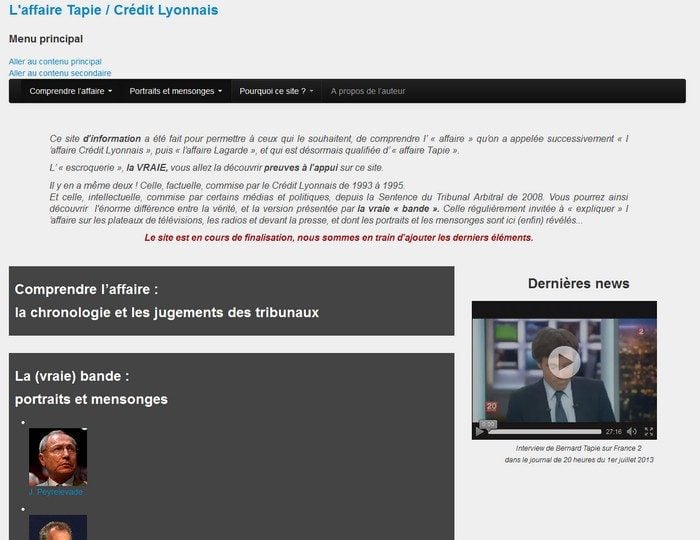 L’auteur du site, Laurent Tapie, indique l’avoir mis en ligne « pour ceux qui veulent savoir la vérité ». Comprendre l’affaire, portraits (dont ceux de Jérôme Cahuzac, du député Charles de Courson, de l’ancien patron du Crédit lyonnais Jean Peyrelevade ou encore de François Bayrou et de Jean-Marc Ayrault) et mensonges sont les principaux onglets de ce site qui se présente comme un « site d’information fait pour comprendre “l’affaire” qu’on a appelée successivement “l’affaire Crédit lyonnais”, puis “l’affaire Lagarde” et qui est désormais qualifiée d’affaire Tapie » et veut dévoiler la « vraie escroquerie, preuves à l’appui ».