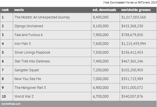 On savait depuis la semaine dernière que Game of Thrones avait été la série la plus téléchargée illégalement en 2013. Le site TorrentFreak publie maintenant la suite de son palmarès : à savoir le classement des longs métrages les plus prisés des pirates sur BitTorrent. Et c’est le film de Peter Jackson, The Hobbit, qui remporte la palme avec 8,4 millions de téléchargements.